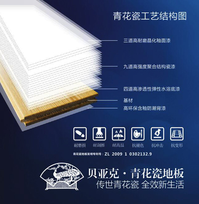 采用了多項國家發明專利青花瓷工藝技術,地板表面耐磨轉數高達4000轉以上,地板漆膜耐磨損、耐刮擦、耐高溫、抗沖擊、抗褪色、抗變形性能均優于普通實木復合普通漆面地板數倍以上。