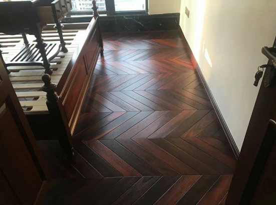 天津貝亞克客戶實木復合魚骨拼酸枝木地板鋪裝...